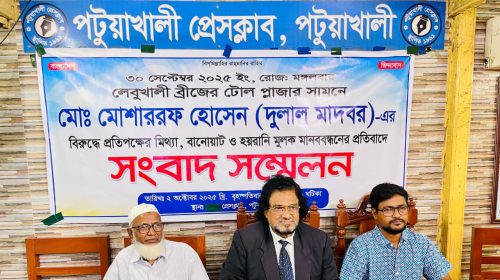 ডেক্পস রিপোর্ট পটুয়াখালীর দুমকি উপজেলার লেবুখালী টোল প্লাজার সামনে বিএনপি নেতা মোশাররফ হোসেন দুলাল মাদবরের বিরুদ্ধে মিথ্যা, ভিত্তিহীন ও হয়রানি মূলক মানববন্ধনের প্রতিবাদে সংবাদ সম্মেলন অনুষ্ঠিত হয়েছে। বৃহস্পতিবার (০২ নভেম্বর)…