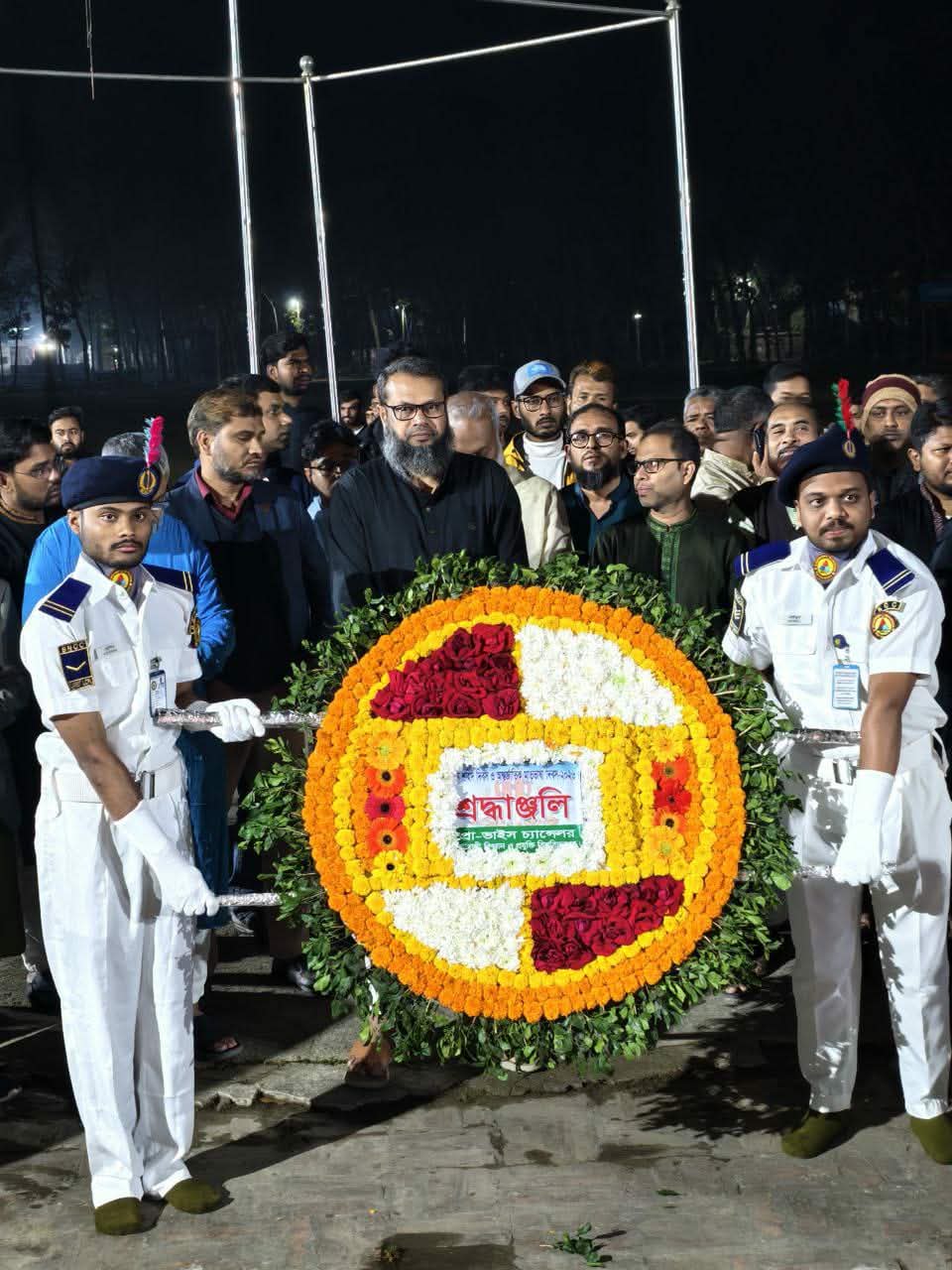 একুশের প্রথম প্রহরে রাত ১২টা ১ মিনিটে বিশ্ববিদ্যালয়ের কেন্দ্রীয় শহীদ মিনারে পুষ্পস্তবক অর্পণের মাধ্যমে কর্মসূচির সূচনা হয়। এ সময় উপ-উপাচার্য অধ্যাপক ড. এস. এম. হেমায়েত জাহান ভাষা শহীদদের প্রতি শ্রদ্ধা জানান। পরে বিশ্ববিদ্যালয়ের বিভিন্ন অনুষদ, আবাসিক হল এবং সামাজিক ও সাংস্কৃতিক সংগঠনের পক্ষ থেকে পর্যায়ক্রমে পুষ্পস্তবক অর্পণ করা হয়।