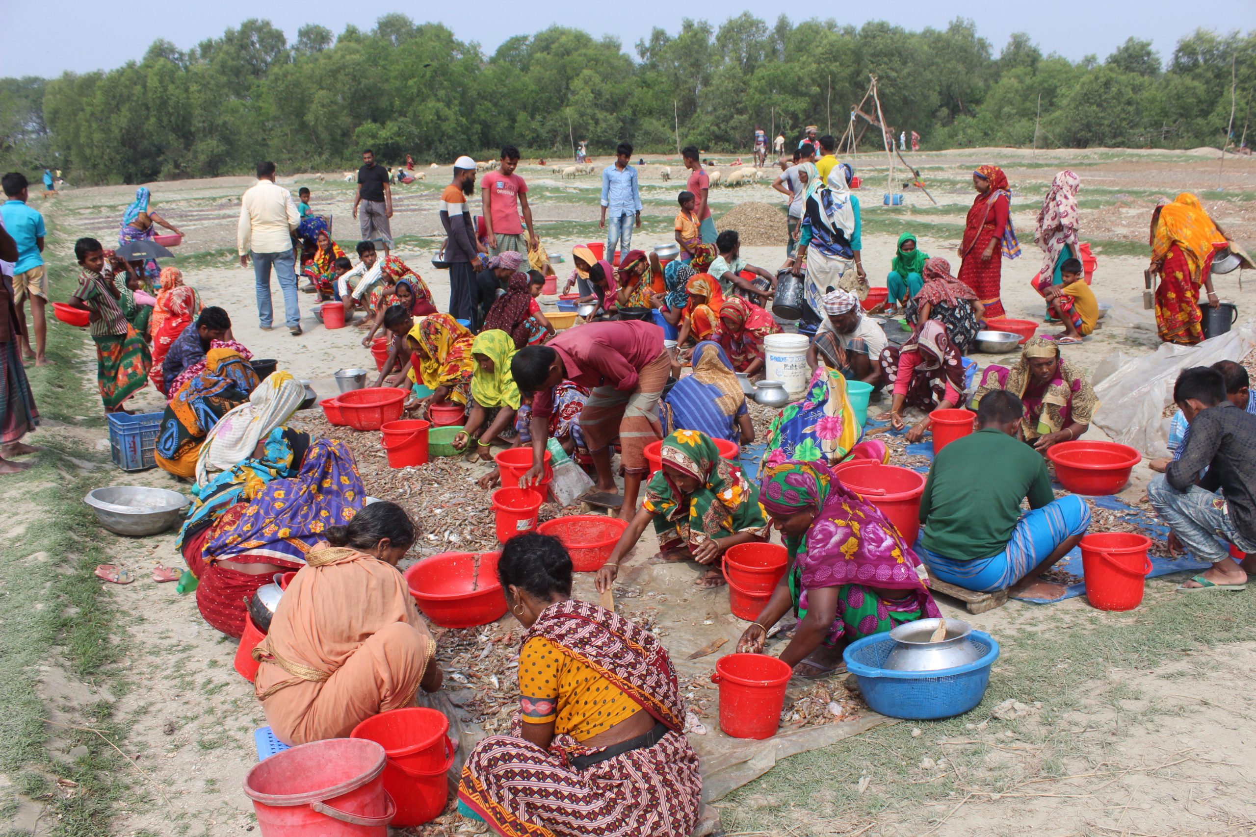 সরেজমিনে দেখা যায় যে, প্রতিদিন সকাল থেকে বিকাল পর্যন্ত ৩০ থেকে অন্তত ৪০টি ট্রলার সাগর থেকে মাছ ধরে সেই নদীর পাড়ে নোঙর করেছে। পাশেই খোলা আকাশের নীচে কয়েকশ নারী শ্রমিক পাতিল নিয়ে বসে আছে। পুরুষ শ্রমিকরা সেই ট্রলার থেকে মাছ উঠিয়ে তীরে ফেলে দিচ্ছে, আর নারীরা তা নিজেদের কাছে নিয়ে বাছাই শুরু করছেন। খালি হাতেই নারীরা চিংড়ি মাছের মাথা ছিড়ে আলাদা করে রাখছেন। পরে চিংড়ির মূল অংশ সেখান থেকে খুলনা এবং ঢাকায় নিয়ে যাবার পর সেখান থেকে বিদেশে রপ্তানি করা হয়।