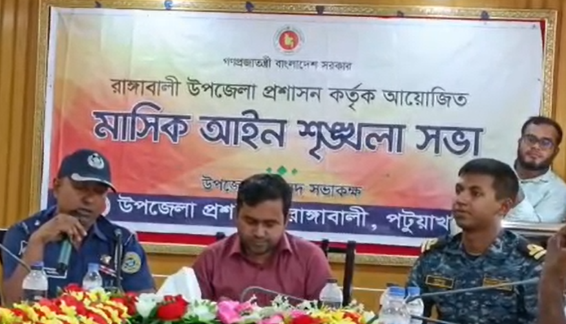 পটুয়াখালীর রাঙ্গাবালী উপজেলায় আইন-শৃঙ্খলা কমিটির মাসিক সভা অনুষ্ঠিত হয়েছে। মঙ্গলবার সকাল ১১টার সময় উপজেলা পরিষদ হল রুমে রাঙ্গাবালী উপজেলা প্রশাসনের আয়োজনে উপজেলার সকল বিষয়ে মাসিক আইন-শৃঙ্খলা কমিটির মাসিক সভা অনুষ্ঠিত হয়েছে। এতে উপজেলা নির্বাহী অফিসার (ইউএনও) রাজিব দাশ পুরকায়স্থ এর সভাপতিত্বে, বাংলাদেশ নৌবাহিনীর কন্টিনজেন্ট কমান্ডার আতিকুর, রাঙ্গাবালী থানার অফিসার ইনচার্জ ওসি মো: শামীম হাওলাদার, রাঙ্গাবালী উপজেলা কৃষি অফিসার মো: আসাদুজ্জামান, উপজেলা বিএনপির সভাপতি আব্দুর রহমান ফরাজি ও সাধারণ সম্পাদক হারুন আর রশিদ হাওলাদার, উপজেলা জামাত ইসলামের আমীর মাওলানা কবির হোসেন, সহ উপজেলার বিভিন্ন সরকারি দপ্তরের কর্মকর্তা এবং প্রিন্ট ও ইলেকট্রনিক মিডিয়ার সাংবাদিকরা উপস্থিত ছিলেন।এ সময় ক্তারা মাদক, জুয়া, বাল্যবিবাহসহ বিভিন্ন সামাজিক ব্যাধি নিরসনে জনসচেতনতা বৃদ্ধির ওপর গুরুত্বারোপ করেন। পাশাপাশি আইন-শৃঙ্খলাসহ সার্বিক পরিস্থিতি নিয়ন্ত্রণে রাখতে সম্মিলিতভাবে কাজ করার আহ্বান জানান।