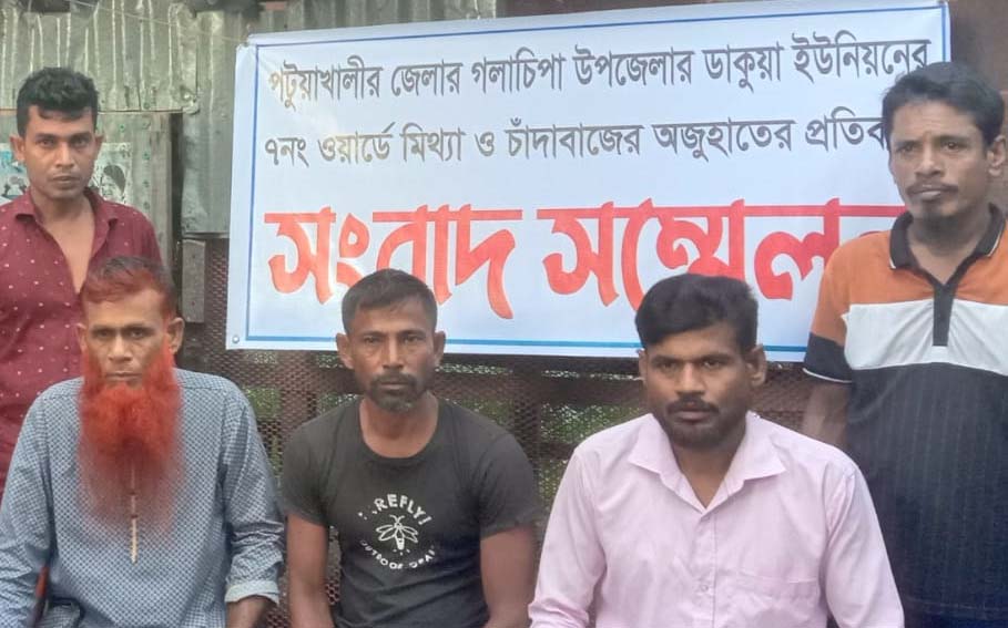 পটুয়াখালীর গলাচিপায় মিথ্যে চাঁদাবাজির অভিযোগের প্রতিবাদে সাইদুল খানের সংবাদ সম্মেলন। মঙ্গলবার সকাল ১০ টায় উপজেলার ডাকুয়া ইউনিয়নের বাংলাবাজার এলাকায় এ সংবাদ সম্মেলন অনুষ্ঠিত হয়। সংবাদ সম্মেলনে ডাকুয়া ইউনিয়ন ৭ নম্বর ওয়ার্ড মো. সাইদুল খান বলেন, এলাকায় বসবাসরত নাজিম শিকদার নামের এক ব্যক্তি তিনিসহ তার ভাইদের নামে ঐ এলাকার বাসিন্দা স্বদেব ভূইয়ার কাছে চাঁদা দাবির একটি অভিযোগ তুলে এলাকায় প্রচার করে। যা সম্পূর্ণ মিথ্যে ও ভিত্তিহীন। যার কাছে চাঁদা দাবির কথা বলা হয়েছিল সেই স্বদেব ভূইয়া সংবাদ সম্মেলনে উপস্থিত থেকে তিনি বলেন, আমার কাছে তারা কখনও চাঁদা দাবি করেনি তাছাড়া চাঁদা চাওয়ার বিষয়ে তিনি কিছুই জানেনা। সংবাদ সম্মেলনে নাশির খান ও শাহাবুদ্দিন খান বলেন, তারা বিএনপি পরিবারের সদস্য। তারা কখনও চাঁদাবাজি ও অনৈতিক কর্মকাণ্ডের সাথে সম্পৃক্ত নন। যিনি এ রকম মিথ্যে গুজব ছড়িয়েছেন তাকে আইনের আওতায় এনে বিচারের দাবি জানান।