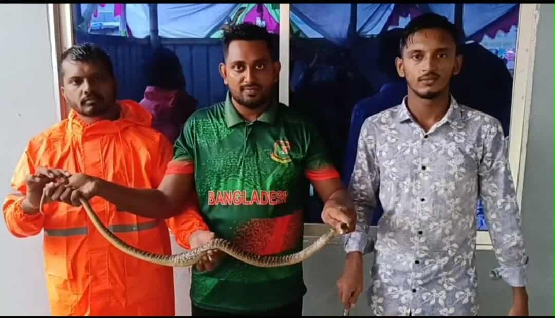পটুয়াখালীর কুয়াকাটায় প্রায় ৪ ফুট লম্বা বিষধর একটি পদ্মগোখরা সাপ উদ্ধার করা হয়েছে। বৃহস্পতিবার (২১ আগস্ট) সকাল ৯টার দিকে উপজেলার পৌরসভার হোসেন পাড়া থেকে সাপটি উদ্ধার করেন ‘অ্যানিম্যাল লাভারস অফ পটুয়াখালী’র বন্যপ্রাণী উদ্ধারকর্মীরা।
