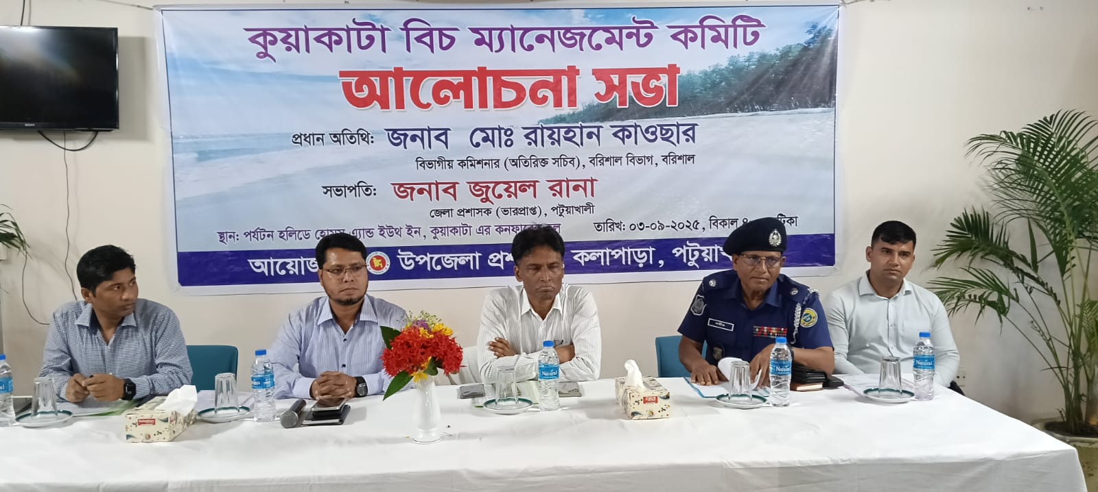 কুয়াকাটায় সৈকত সুরক্ষা ও উন্নয়ন বিষয়ক কুয়াকাটা বিচ ম্যানেজমেন্ট কমিটির আলোচনা সভা অনুষ্ঠিত হয়েছে। বুধবার বিকেল ৫টায় কুয়াকাটা পর্যটন হলিডে হোমস অ্যান্ড ইয়ুথ ইন কনফারেন্স হলে এ সভা হয়।