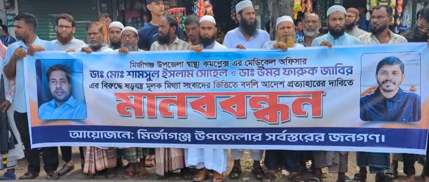 পটুয়াখালীর মির্জাগঞ্জ উপজেলা স্বাস্থ্য কমপ্লেক্সের আবাসিক চিকিৎসক মো. সামসুল ইসলাম সোহেল ও চিকিৎসক (মেডিকেল অফিসার) মো. উমর ফারুক জাবিরের বদলির আদেশ প্রত্যাহারের দাবিতে মানববন্ধন ও বিক্ষোভ কর্মসূচি অনুষ্ঠিত হয়েছে।