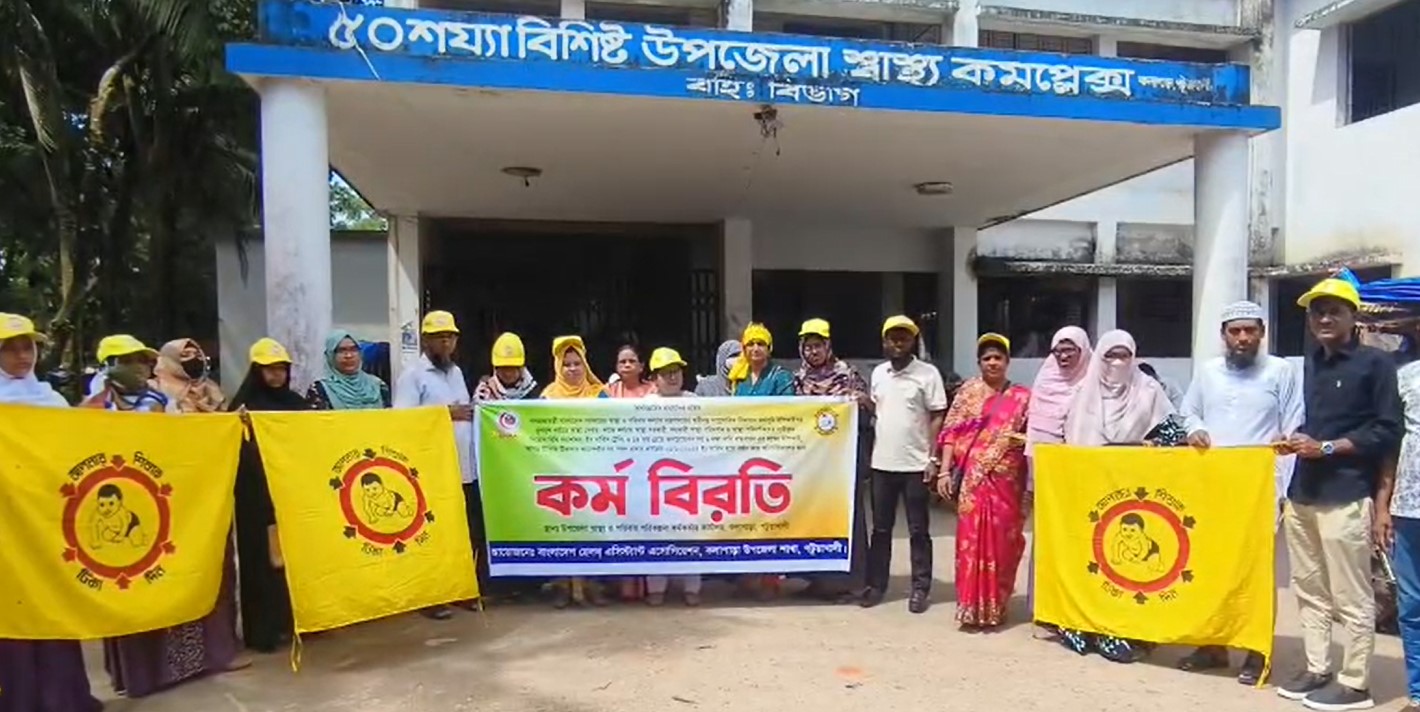 ৬ দফা দাবিতে সারাদেশের ন্যায় পটুয়াখালীতে কর্ম বিরতি পালন করছে স্বাস্থ্য সহকারীরা। রবিবার সকালে কলাপাড়া উপজেলা স্বাস্থ্য কমপ্লেক্সের সামনে ব্যানার ও ফেস্টুন হাতে এ কর্মসূচি পালন করেন তারা। গত ১ অক্টোবর থেকে শুরু হওয়া এ কর্মবিরতির ফলে বন্ধ রয়েছে শিশুদের রুটিন ইপিআই টিকাদান কার্যক্রম। এতে ভোগান্তিতে পড়েছে গ্রামীন শিশু রোগীর স্বজনরা। কর্ম বিরতি চলাকালে বক্তব্য রাখেন বাংলাদেশ হেলথ এ্যাসিস্ট্যান্ট এ্যাসোসিয়েশনের কলাপাড়ার শাখার সভাপতি জাহিদুল ইসলাম, সদস্য জুলিয়া নাসরিন ও মনিরা সুলতানা।