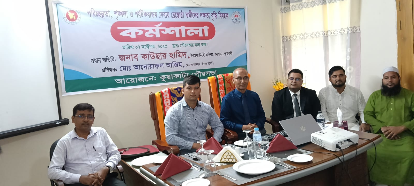 পরিচ্ছন্নতা, শৃঙ্খলা ও পর্যটকবান্ধব সেবা নিশ্চিত করতে কুয়াকাটায় রেস্তোরাঁ কর্মীদের দক্ষতা বৃদ্ধিমূলক একদিনব্যাপী কর্মশালা অনুষ্ঠিত হয়েছে। মঙ্গলবার (৭ অক্টোবর) সকালে কুয়াকাটা পৌরসভা মিলনায়তনে এ কর্মশালার আয়োজন করে কুয়াকাটা পৌরসভা।