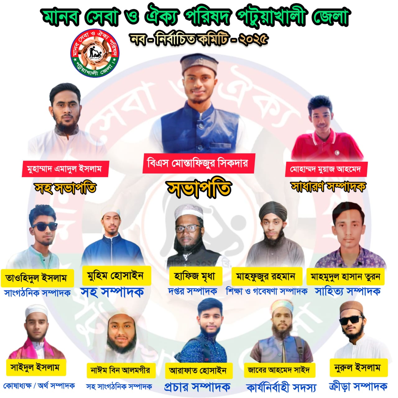 মানব সেবা ও ঐক্য পরিষদ, পটুয়াখালী জেলা শাখার ২০২৫-২০২৬ কার্যবর্ষের জন্য ১৭ সদস্য বিশিষ্ট পূর্ণাঙ্গ কমিটি গঠন করা হয়েছে। সংগঠনটি একটি সেবামূলক ও স্বেচ্ছাসেবী সংস্থা হিসেবে দীর্ঘদিন ধরে সমাজের দরিদ্র, অসহায় ও মানবিক সহায়তার কাজে নিয়োজিত রয়েছে।