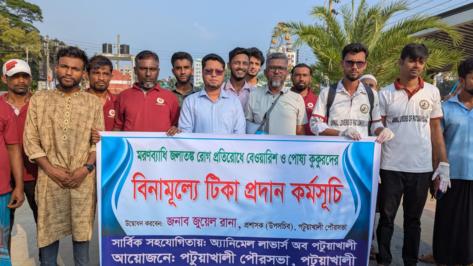 পটুয়াখালী শহরে বেওয়ারিশ কুকুরের জলাতঙ্ক প্রতিরোধে টিকা প্রদানের কার্যক্রম শুরু হয়েছে। বুধবার (১৫ অক্টোবর) বিকেলে শহরের ঝাউবন এলাকার ফোর লাইন সড়কে পরিবেশবাদী সংগঠন ‘অ্যানিমেল লাভার্স অব পটুয়াখালী’-এর সহযোগিতায় পৌরসভা ও জেলা প্রাণিসম্পদ দপ্তরের যৌথ উদ্যোগে এ কর্মসূচির উদ্বোধন করা হয়।