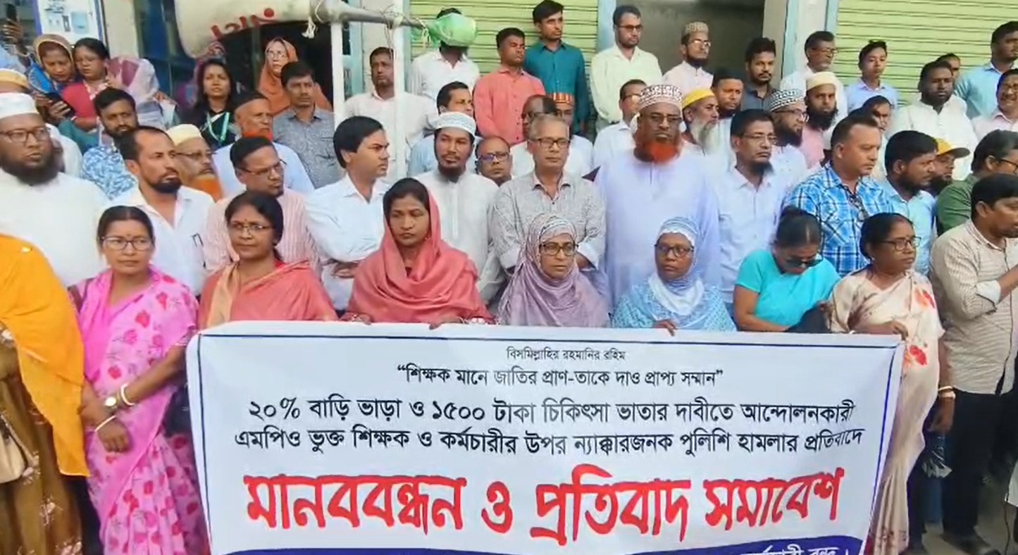 ২০ ভাগ বাড়ি ভাড়া, পনেরশ টাকা চিকিৎসা ভাতা ও ঢাকায় পুলিশি হামলার প্রতিবাদে পটুয়াখালীর কলাপাড়ায় মানববন্ধন করেছে এমপিওভুক্ত শিক্ষকরা। মঙ্গলবার বেলা এগারোটায় কলাপাড়া প্রেসক্লাবের সামনে এ মানববন্ধন অনুষ্ঠিত হয়। এসময় বক্তব্য রাখেন কলাপাড়া মহিলা কলেজের ভারপ্রাপ্ত অধ্যক্ষ আবুল কালাম আজাদ, কলাপাড়া কলেজ শিক্ষক সমিতির সভাপতি মাসুম বিল্লাহ, খেপুপাড়া নেছারউদ্দিন কামিল মাদ্রাসার অধ্যক্ষ নাসির উদ্দিন হাওলাদার, কলাপাড়া বালিকা মাধ্যমকি বিদ্যালয়ের প্রধান শিক্ষক আনোয়ার হোসেন ও কলাপাড়া মহিলা কলেজের প্রভাষক নেছারউদ্দিন আহমেদ টিপু সহ বিভিন্ন বিদ্যালয়ের শিক্ষকরা। মানববন্ধনে হাজারো শিক্ষকদের উপস্থিতিতে ঘন্টাব্যাপী বন্ধ থাকে ওই সড়কের যান চলাচল। এতে ভোগান্তিতে পড়ে সাধারন মানুষ।