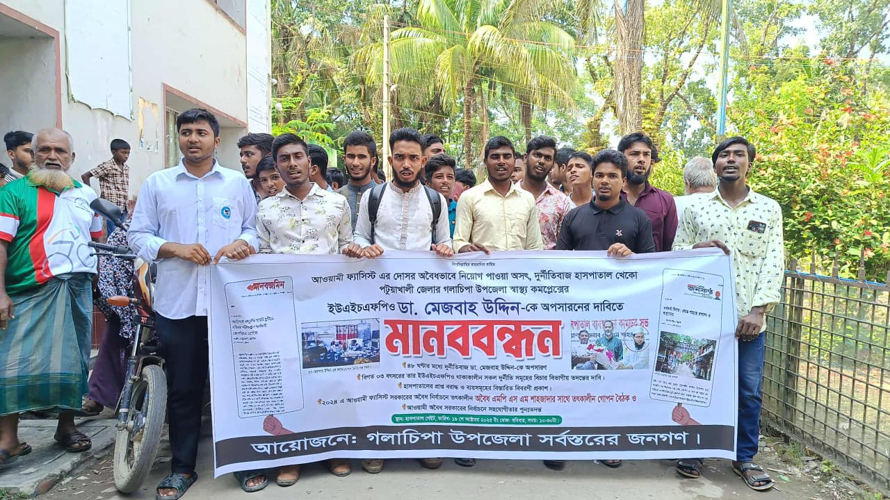 পটুয়াখালীর গলাচিপায় স্বাস্থ্য কর্মকর্তা ডা. মেজবাহ উদ্দিনের অপসারণের দাবিতে মানববন্ধন ও বিক্ষোভ কর্মসূচি করেছেন উপজেলাবাসী। আজ রোববার উপজেলা স্বাস্থ্য কমপ্লেক্স চত্বরে প্রায় ৫শত মানুষ এ কর্মসূচিতে অংশ নেয়। এসময় ৫০ শয্যা বিশিষ্ট উপজেলা স্বাস্থ্য কমপ্লেক্সের অনিয়ম বন্ধের দাবি করা হয়।
